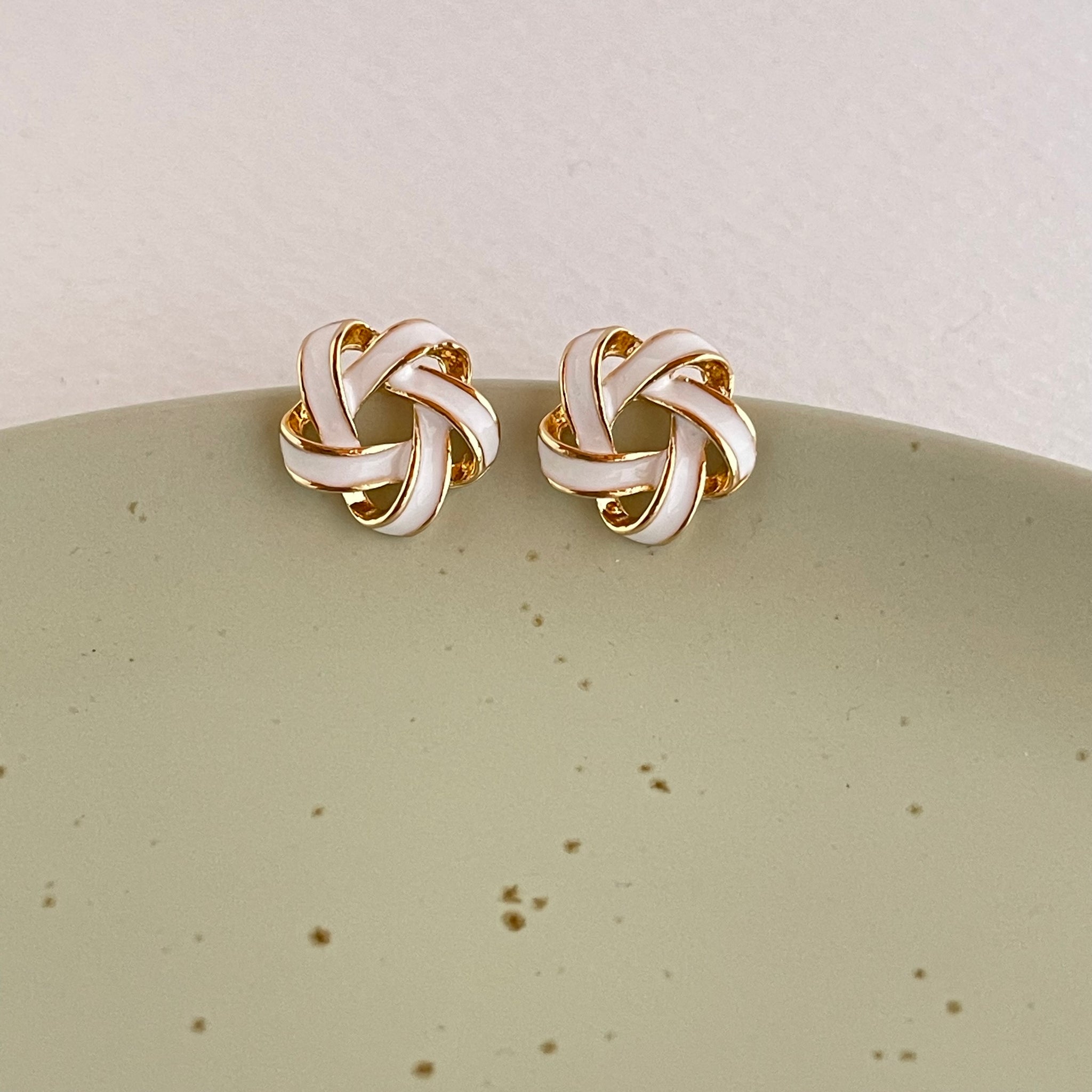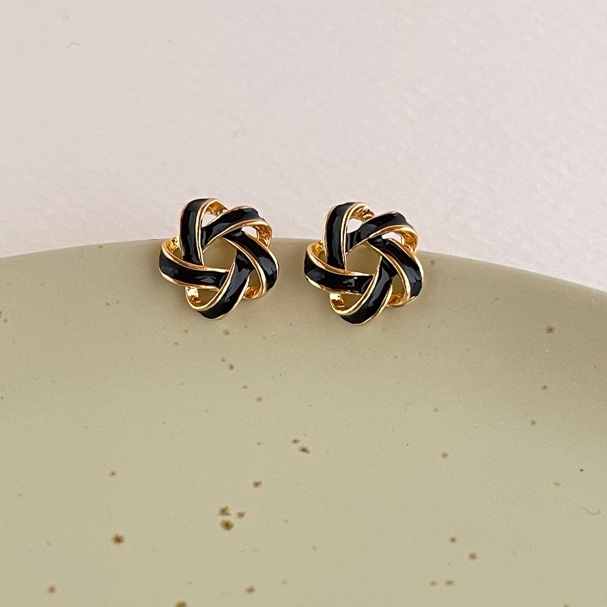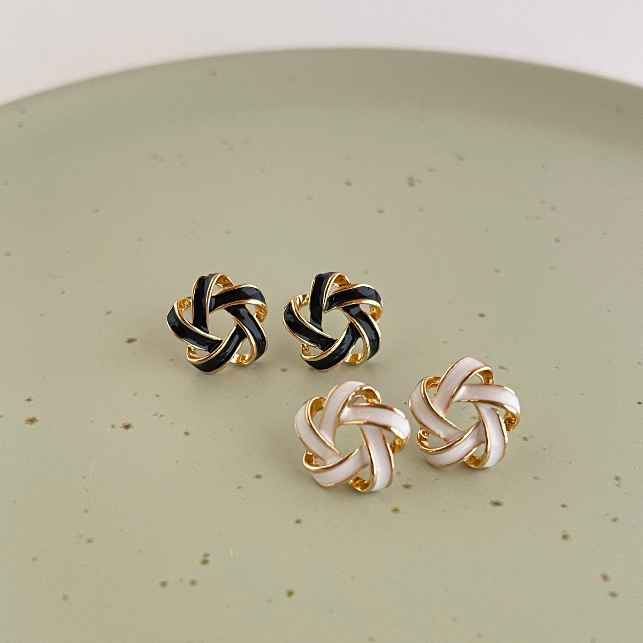 Aretes pequeños en aleación de metales con baño en oro con esmaltado negro y blanco.