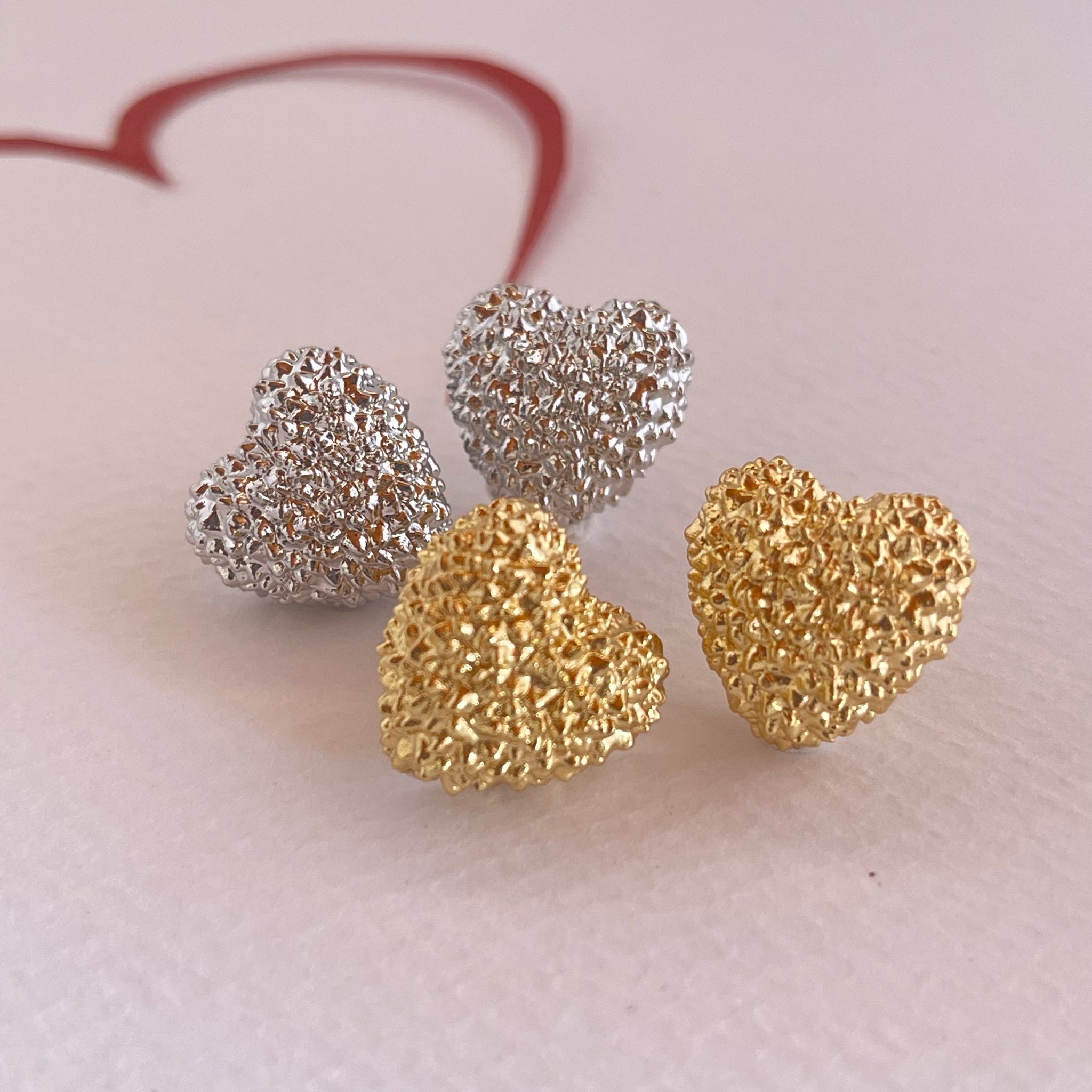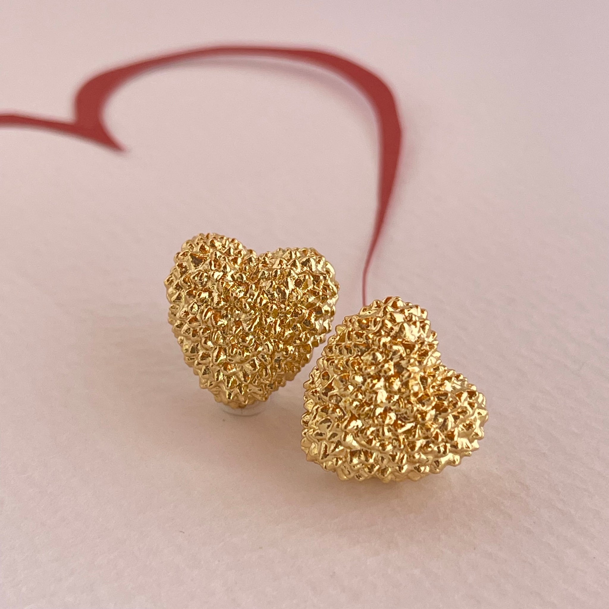 Aretes pequeños en forma de corazón en aleación de metales con baño en rodio color dorado brillante con textura.