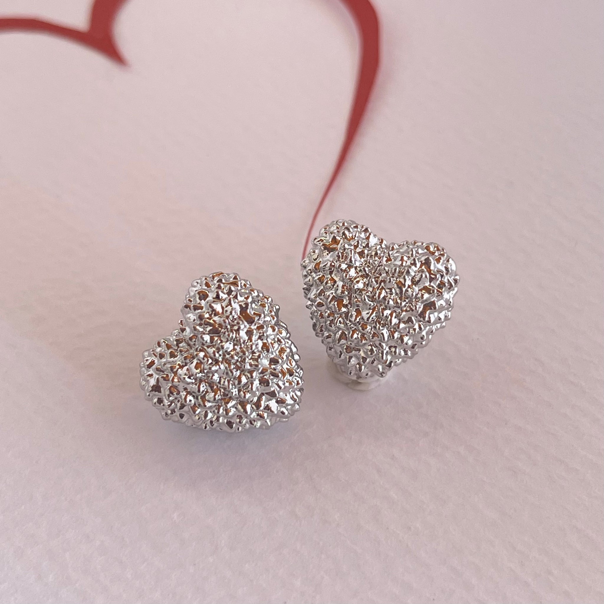 Aretes pequeños en forma de corazón en aleación de metales con baño en rodio color plateado brillante con textura.